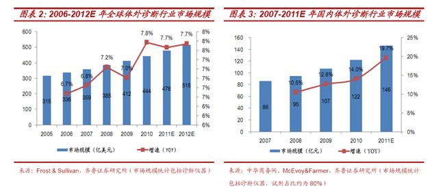 據(jù)McEvoy & Farmer 的市場(chǎng)報(bào)告《中國(guó)臨床診斷市場(chǎng)(2011)》預(yù)測(cè),我國(guó)體外診斷行業(yè)未來增速有望達(dá)到15%-20%,遠(yuǎn)遠(yuǎn)超過全球5%-7%的增長(zhǎng),至2015 年成為全球第三大市場(chǎng);